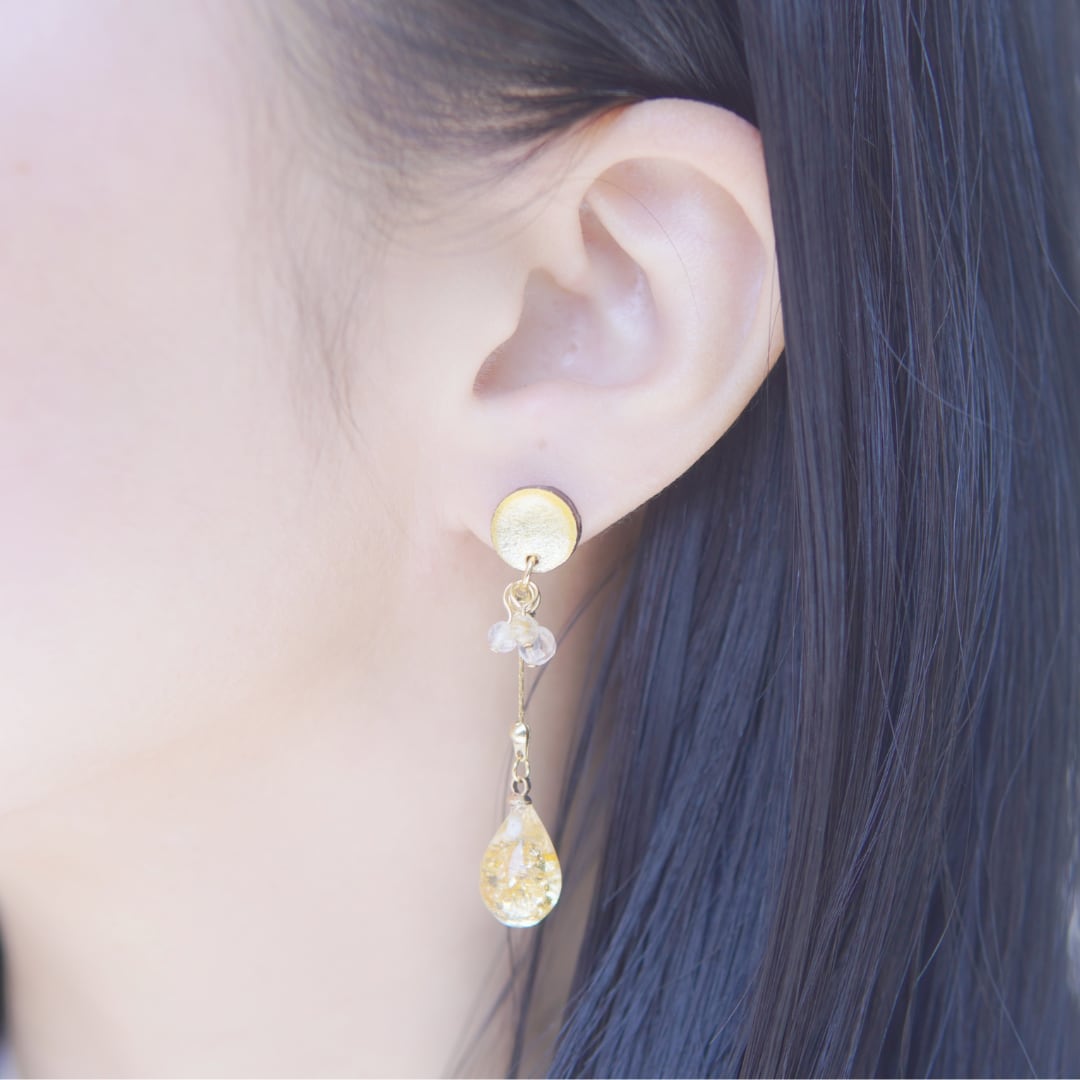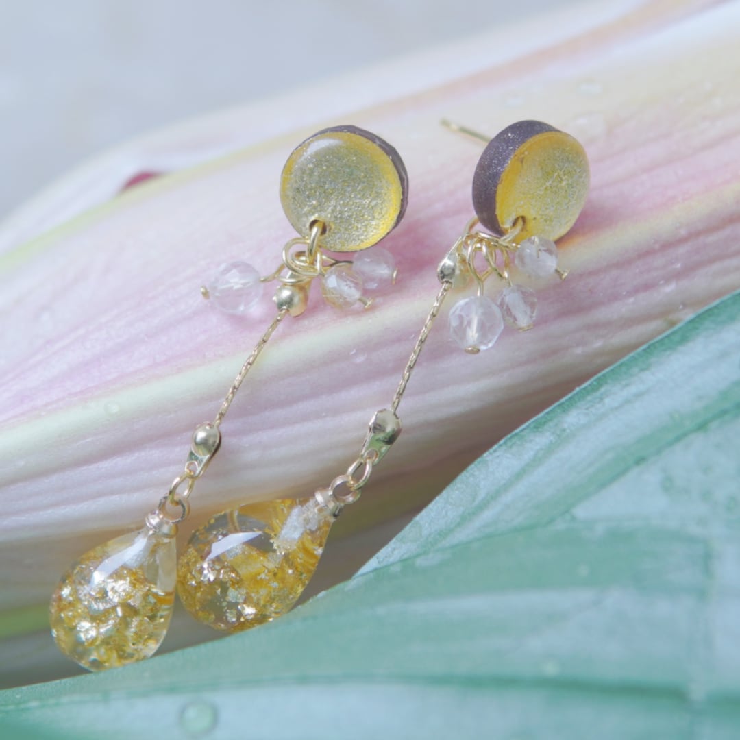 【 Sun Gold / ピアス 】は、朝の散歩中に見つけた露に太陽の光が当たった様子から出来上がりました。柔らかい色の銀箔を貼った上から透明感あるレジンで露のキラキラした表情を表現しています。