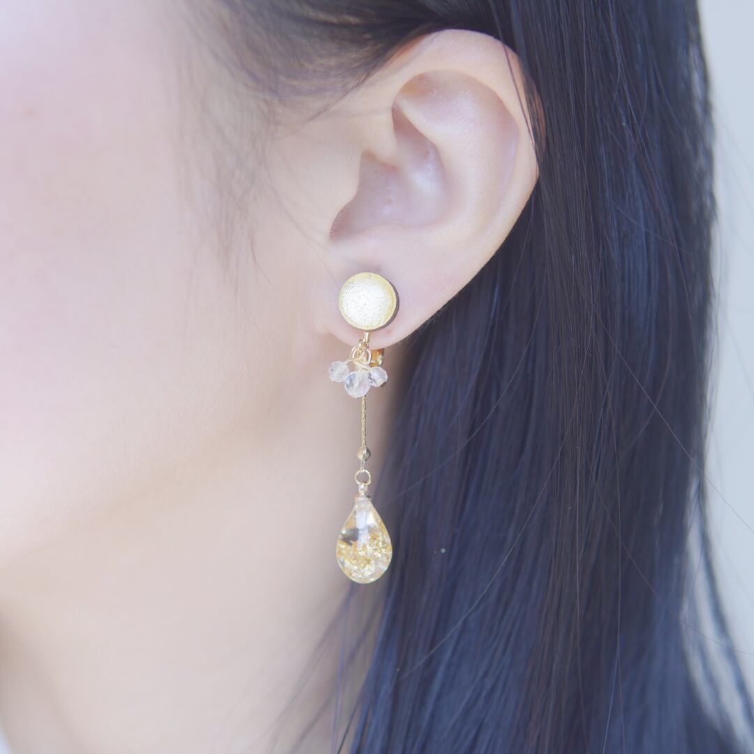 【 Sun Gold / イヤリング 】は、朝の散歩中に見つけた露に太陽の光が当たった様子から出来上がりました。柔らかい色の銀箔を貼った上から透明感あるレジンで露のキラキラした表情を表現しています。