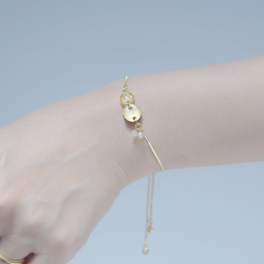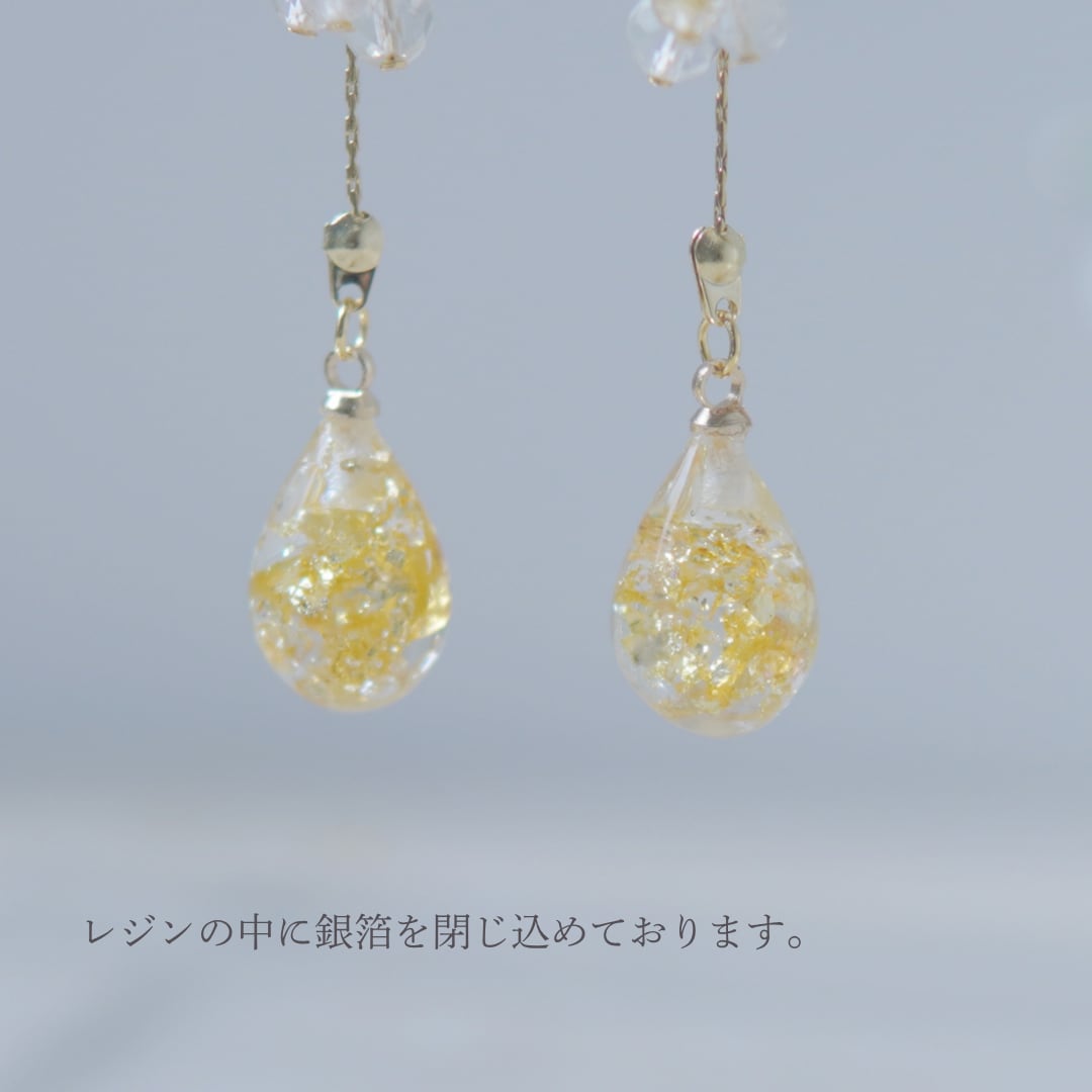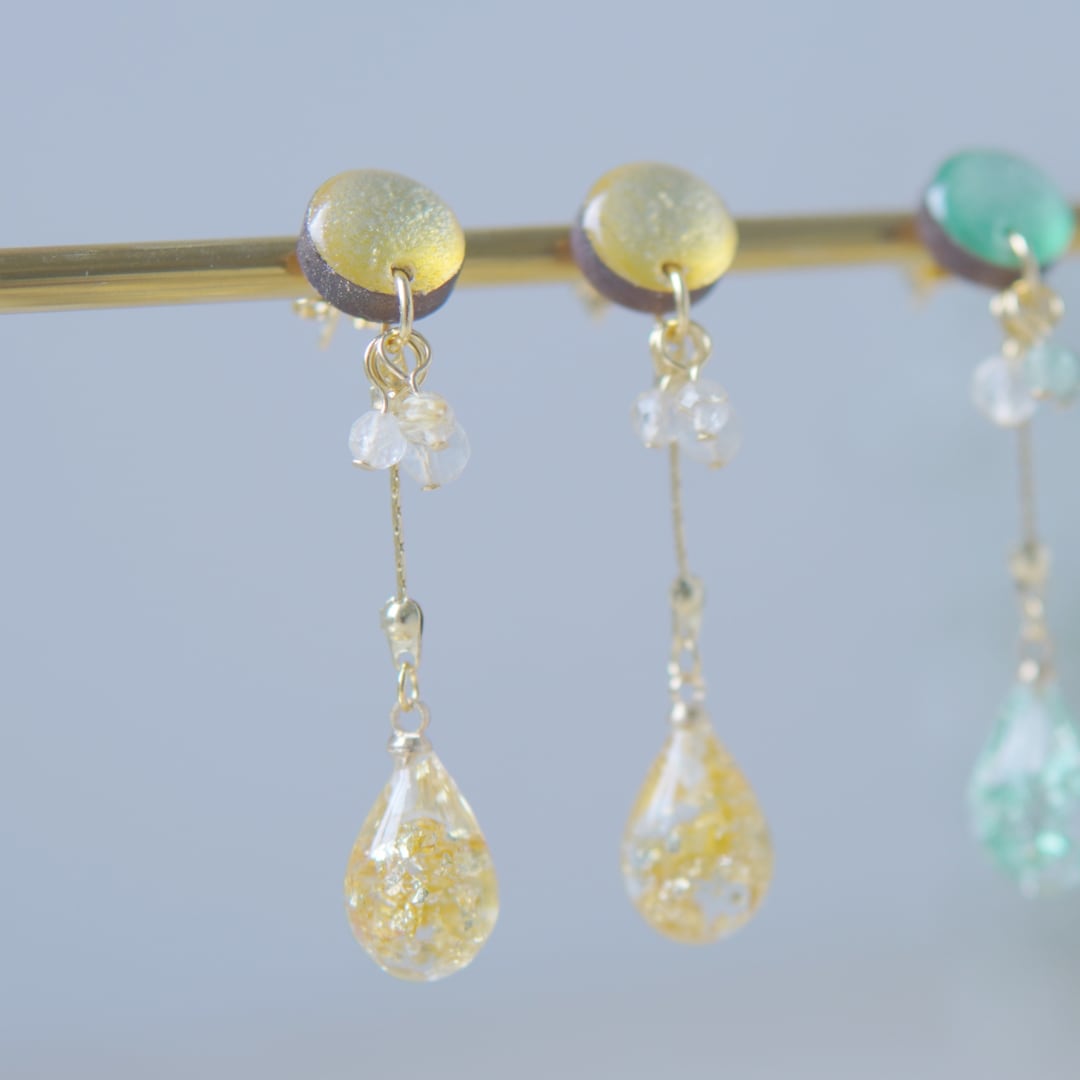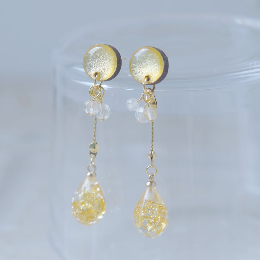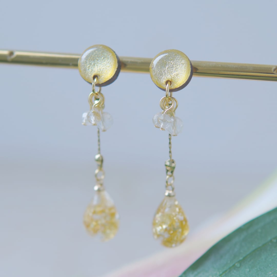 【 Sun Gold / ピアス&ブレスレット 】は、ゴールドの柔らかい色の銀箔を貼った上から透明感あるレジンでお作りしています。露が太陽の光に当たった時のキラキラした表情を表現しているので、肌の上でもとても輝きます。