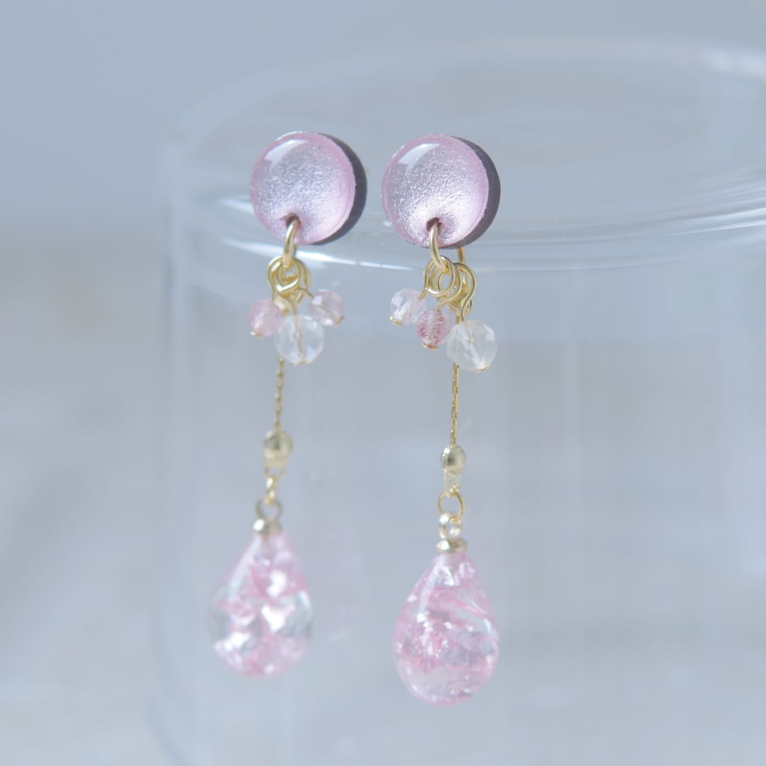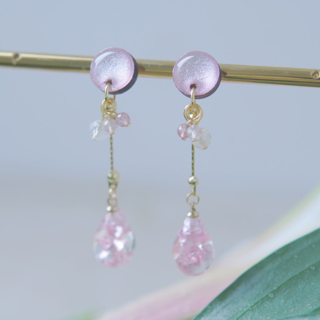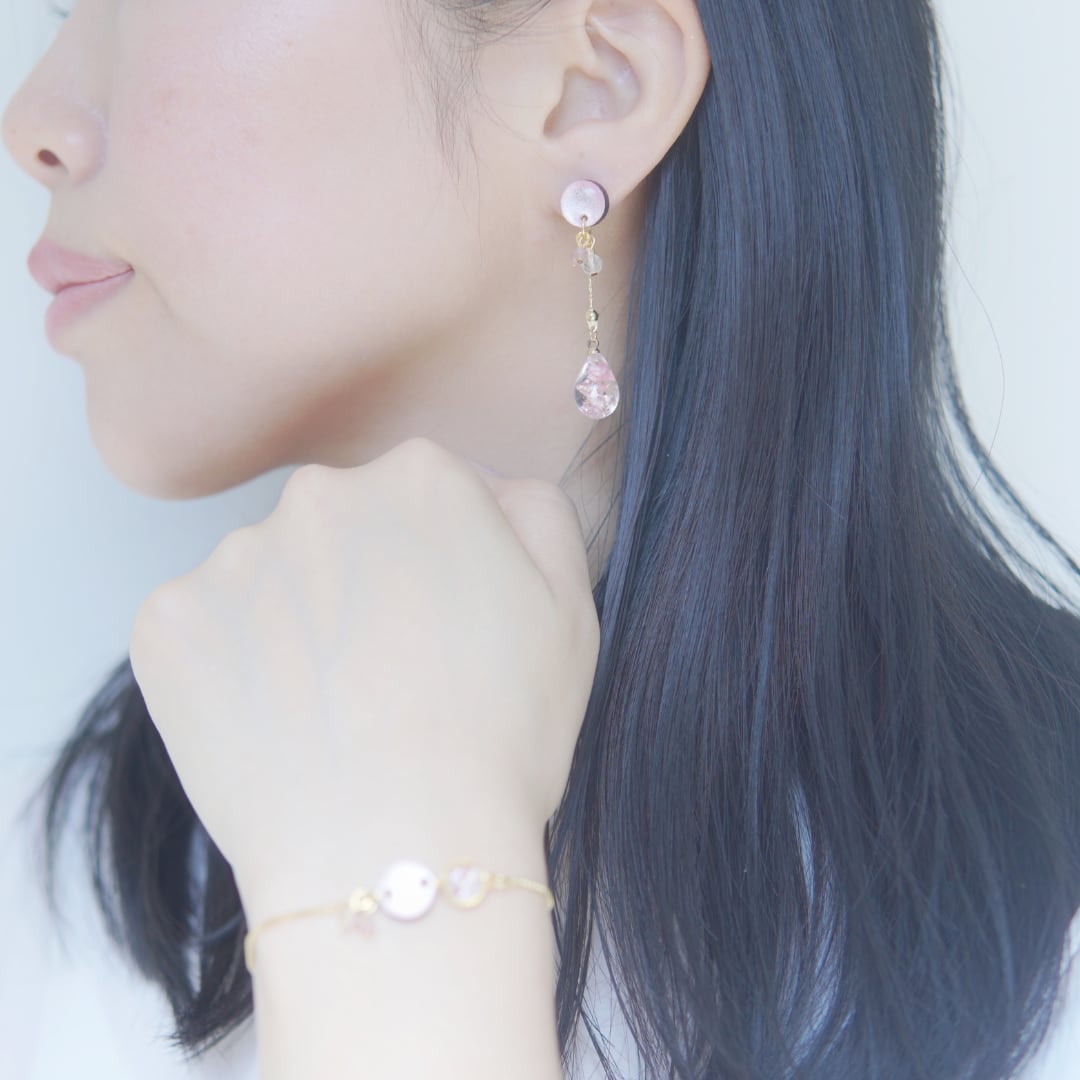 【 Powder Pink / ピアス&ブレスレット 】は、露の中で見た様々な色を表現してみました。露って一色だけじゃないと思ったんです。その中で、春は花が色鮮やかに咲く時期。柔らかい花の一部を摘み取ったような優しいカラーを意識しました。