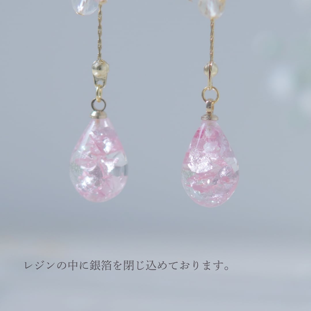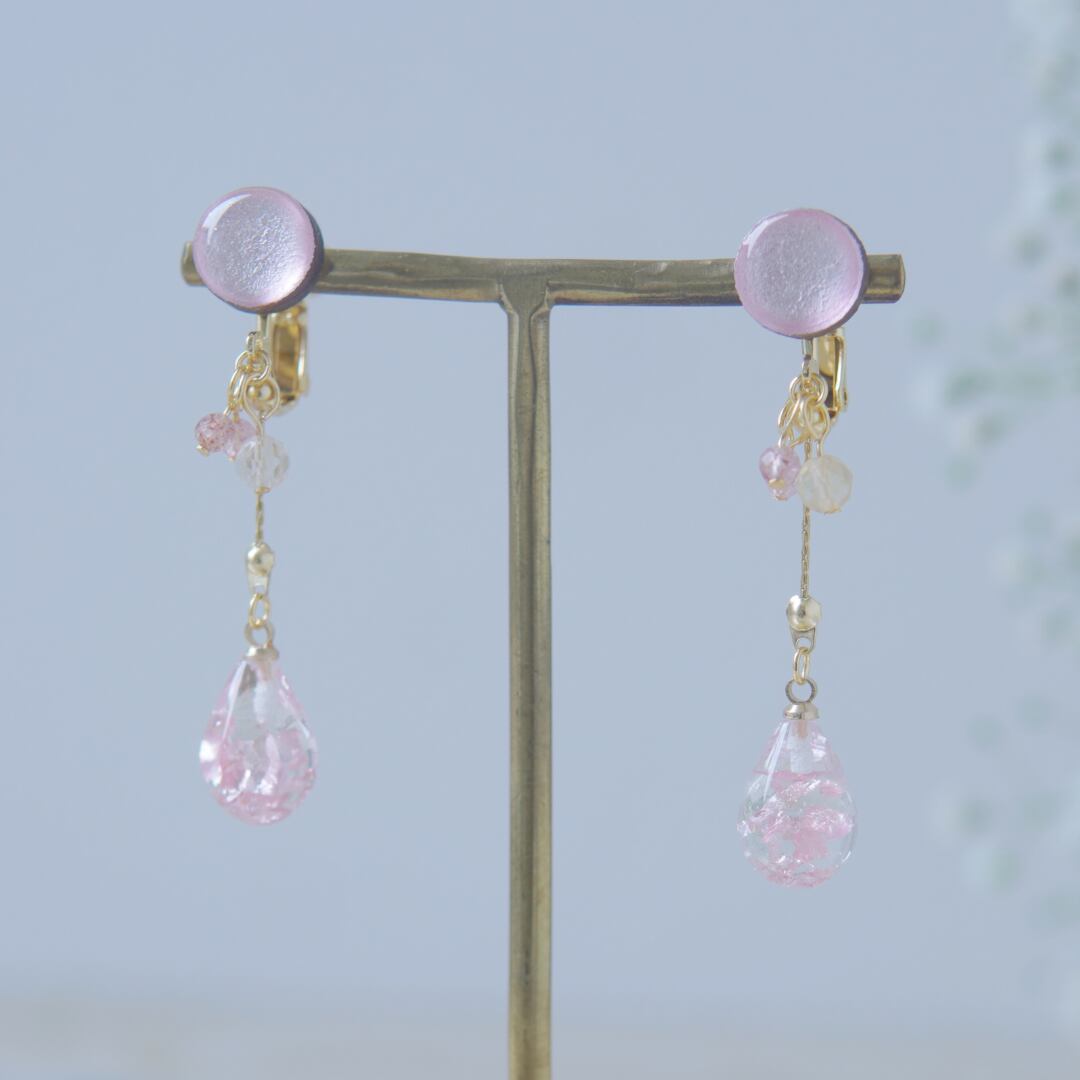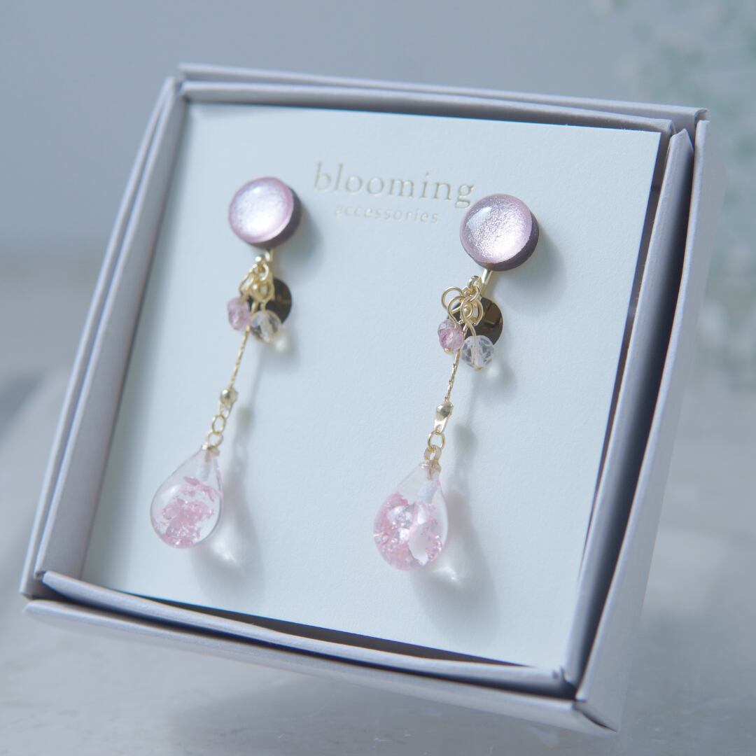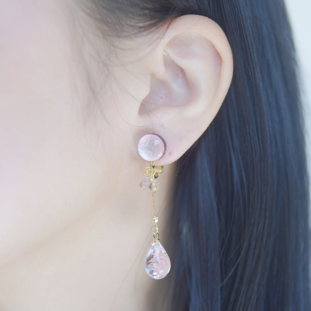 【 Powder Pink / イヤリング&ブレスレット 】は、露の中で見た様々な色を表現してみました。露って一色だけじゃないと思ったんです。その中で、春は花が色鮮やかに咲く時期。柔らかい花の一部を摘み取ったような優しいカラーを意識しました。