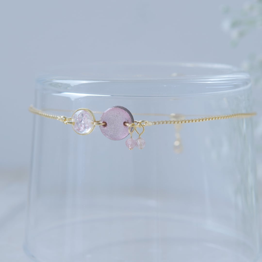 【 Powder Pink / ブレスレット 】は、露の中で見た様々な色を表現してみました。露って一色だけじゃないと思ったんです。その中で、春は花が色鮮やかに咲く時期。柔らかい花の一部を摘み取ったような優しいカラーを意識しました。