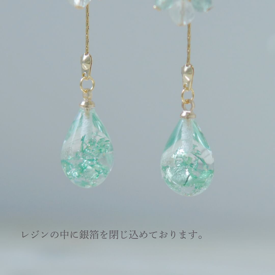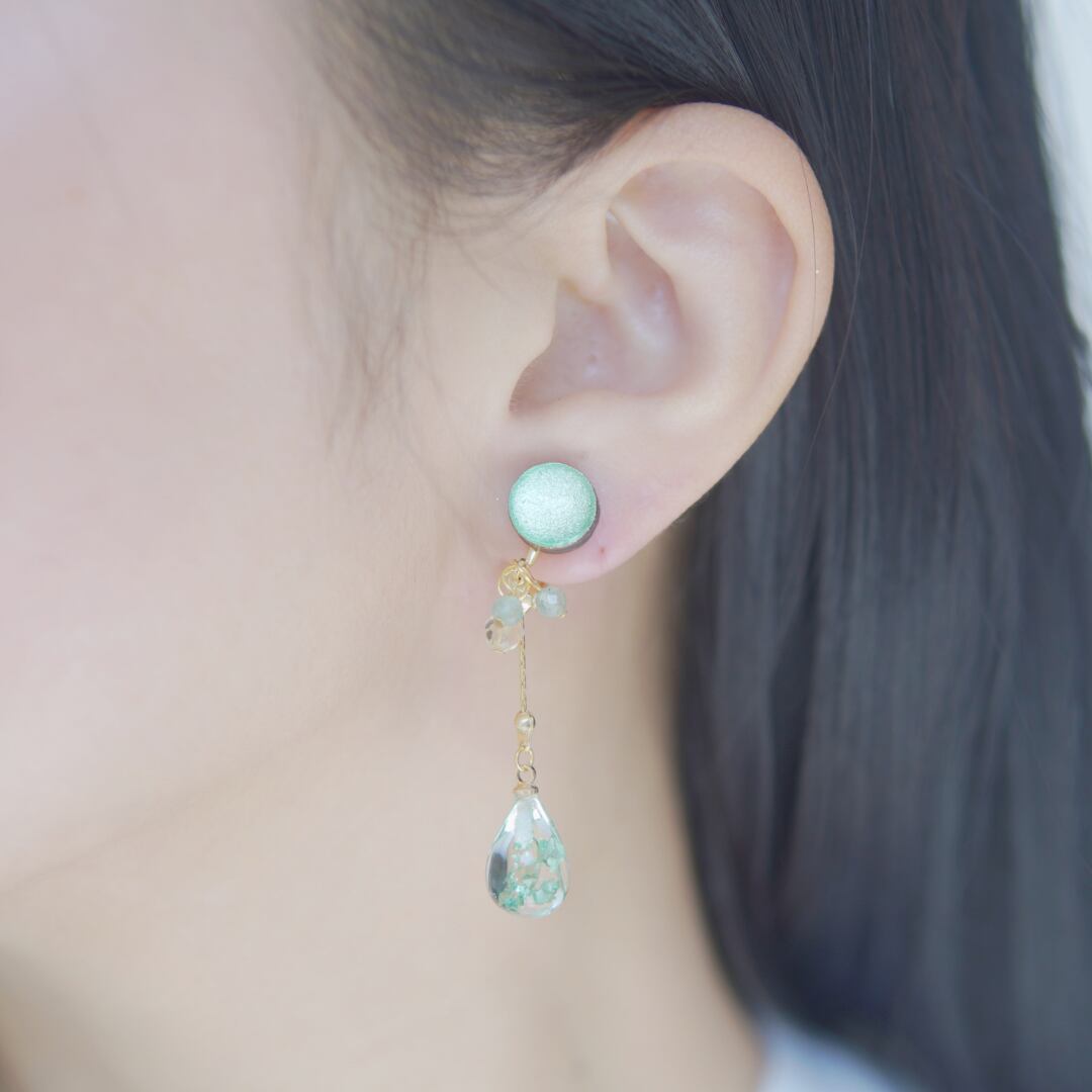 【 Mint Green / イヤリング 】は、新芽の上で転がるように丸く綺麗に光っている露をイメージしました。