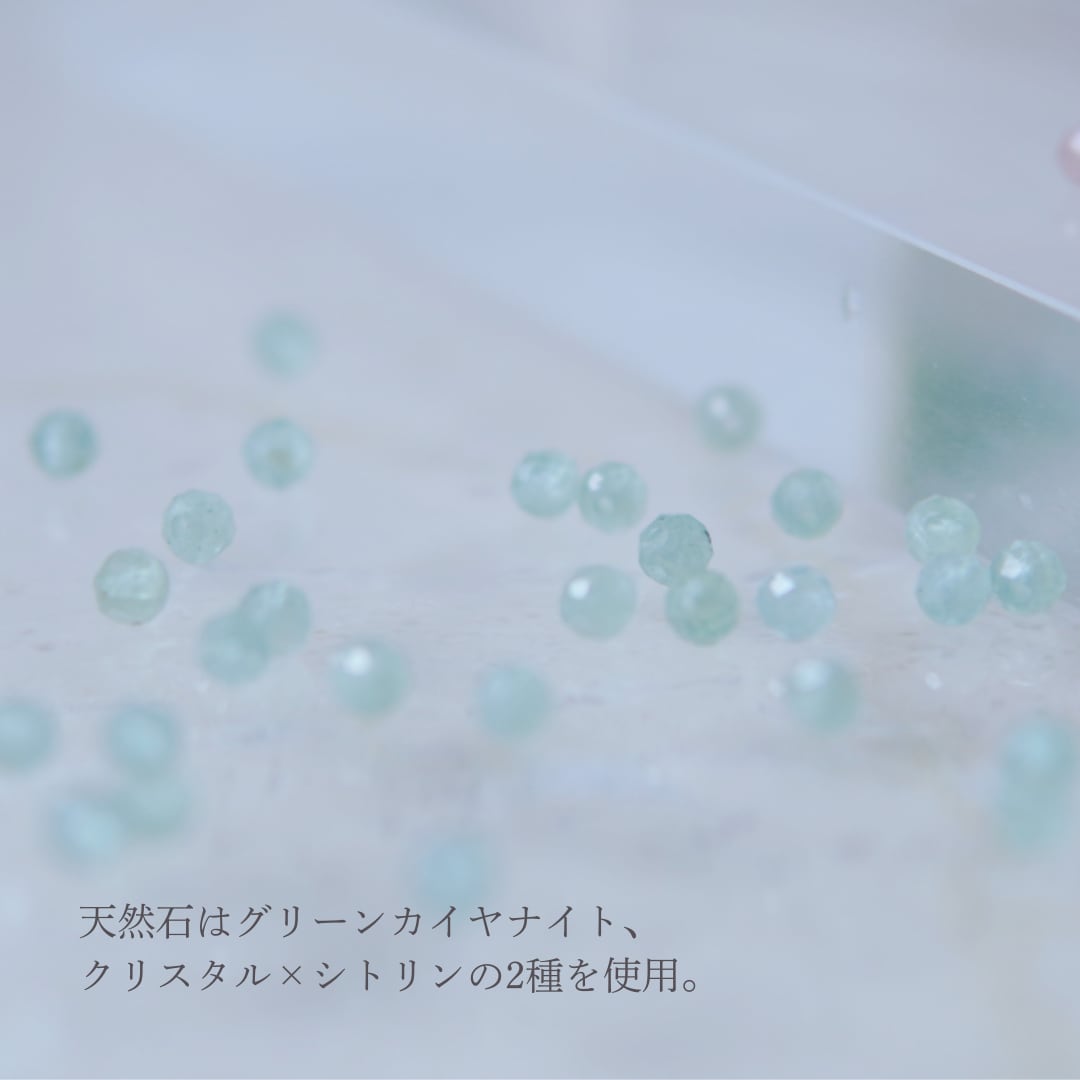 天然石で選んだ、グリーンカイヤナイトは「再出発」「自立」などという石言葉の意味があります。心穏やかに新しい一歩を踏み出したいあなたに届きますように。